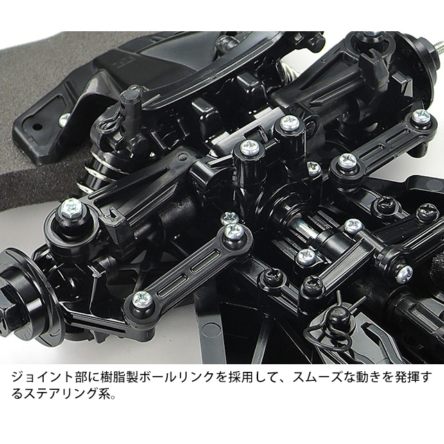 【 基本スペック 】●全長445mm、全幅184mm、全高137mm ●ホイールベース257mm ●タイヤ幅/径=前後とも27/67mm ●フレーム=バスタブタイプ ●駆動方式=縦置きモーター・シャフトドライブ4WD ●デフギヤ=前後とも樹脂製4ベベルタイプ ●ステアリング=3分割タイロッド式 ●サスペンション=4輪ダブルウィッシュボーン ●ダンパー=前後ともフリクション ●ギヤ比=キット標準8.27:1(別売のピニオンと組み合わせて11.38:1~7.28:1までの10種類のギヤ比が選択可能) ●モーター=540タイプ ●スピードコントローラー=ESC仕様(別売)