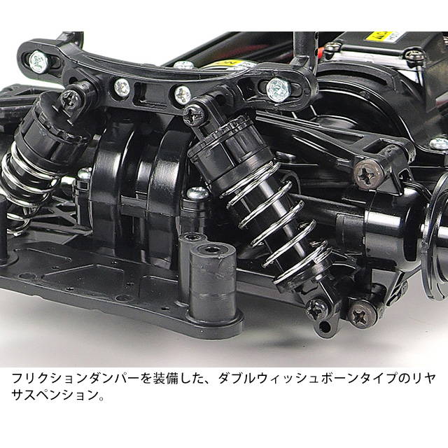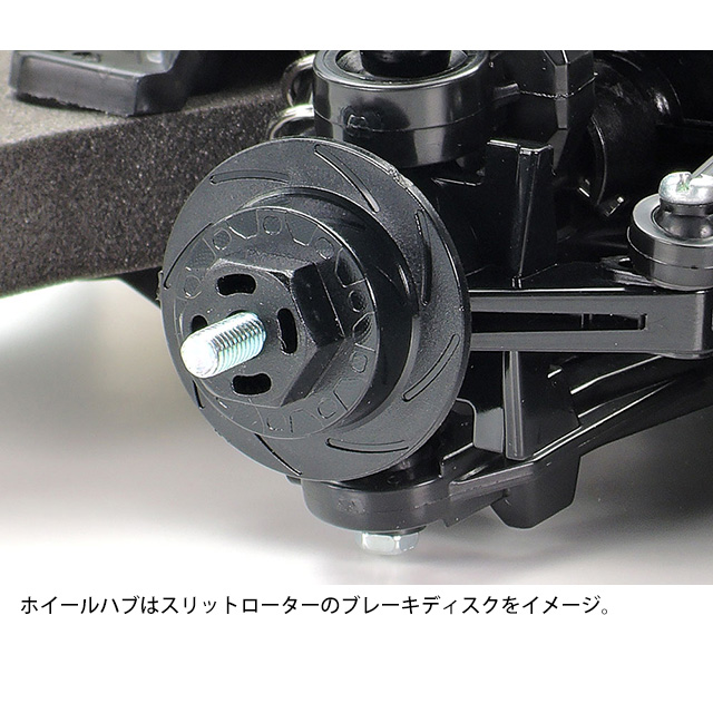 【 操縦性に優れ、セッティングも楽しいシャフトドライブ4WDのTT-02シャーシ 】 シャフトドライブ4WDのTT-02シャーシは、走行用バッテリーを左、モーターを右に縦置きにレイアウトした好バランス設計により操縦安定性に優れ、サスアームやアップライトを左右共通化して組み立てやすく、上下分割式のギヤケースなどにより整備性も高い構成がポイントです。さらに、パーツの組み換えなどによりホイールベース、車高、トレッドがそれぞれ2種類選べ、10種類の幅広いギヤ比が選択できるモーターマウントなどセッティングも楽しめます。また、ホイールハブはブレーキディスク風のデザイン、バンパーには実車のレーシングカートをイメージしたバンパーサポートを装備するなど、遊び心もたっぷり。多孔デザインのシルバーカラーのディッシュホイールには、レーシーな中空ゴム製スリックタイヤを装着しました。