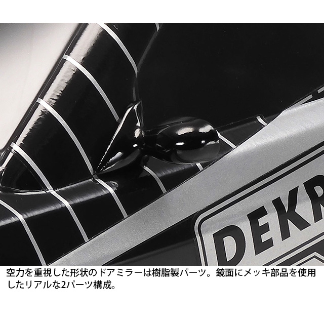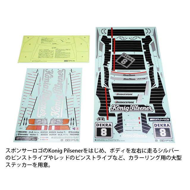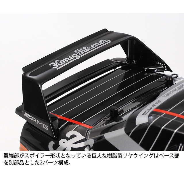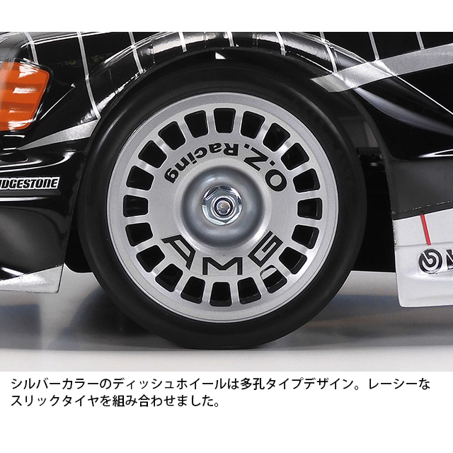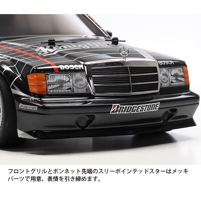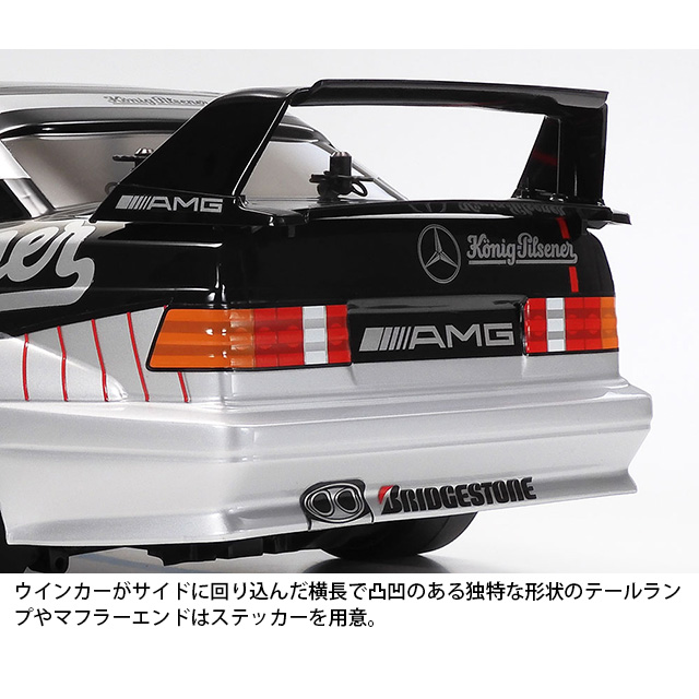 【 ドイツのレースを盛り上げた高性能4ドアセダン 】 メルセデス・ベンツ、アウディ、BMW、オペルといったドイツの自動車メーカーが激戦を繰り広げた1991年のドイツツーリングカー選手権(DTM)。この年のドライバーチャンピオンこそ逃したものの、メーカー&チームのタイトルを獲得したメルセデス・ベンツの1台、カーナンバー8番車の190E 2.5-16 EVO Ⅱを再現した電動RCカーの組み立てキットです。ボクシーな4ドアセダンながら、フロント・リップスポイラーや前後のオーバーフェンダー、高くそびえるようなリヤウイングを装備した迫力あふれるフォルムを実感再現。ボンネット先端のスリーポインテッドスターとフロントグリルはメッキパーツとしました。また、ブラック/シルバーをベースにした特徴的なマーキングはステッカーで再現できます。