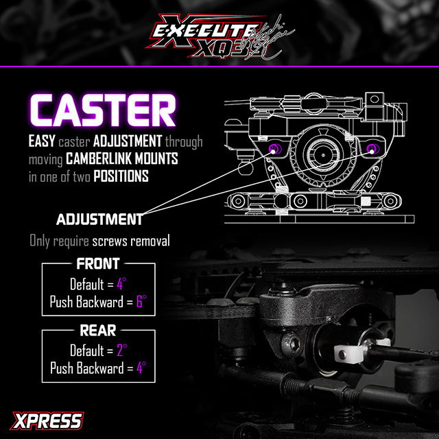 ●2つの位置のいずれかにキャンバーリンクマウントを移動することで、キャスターを簡単に調整