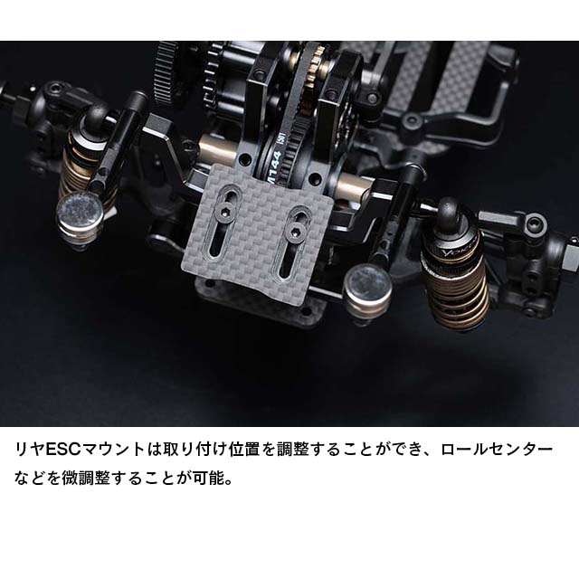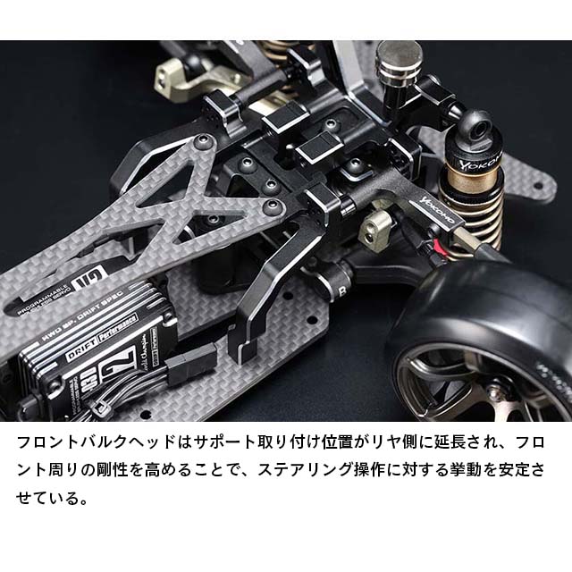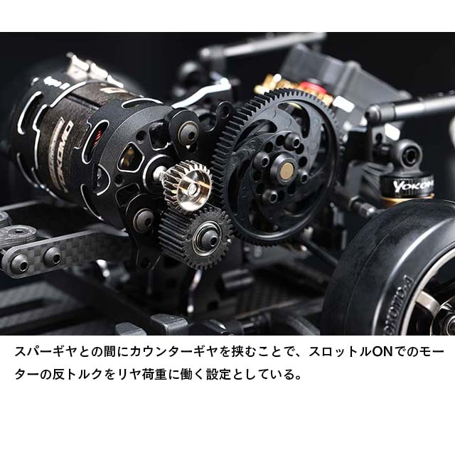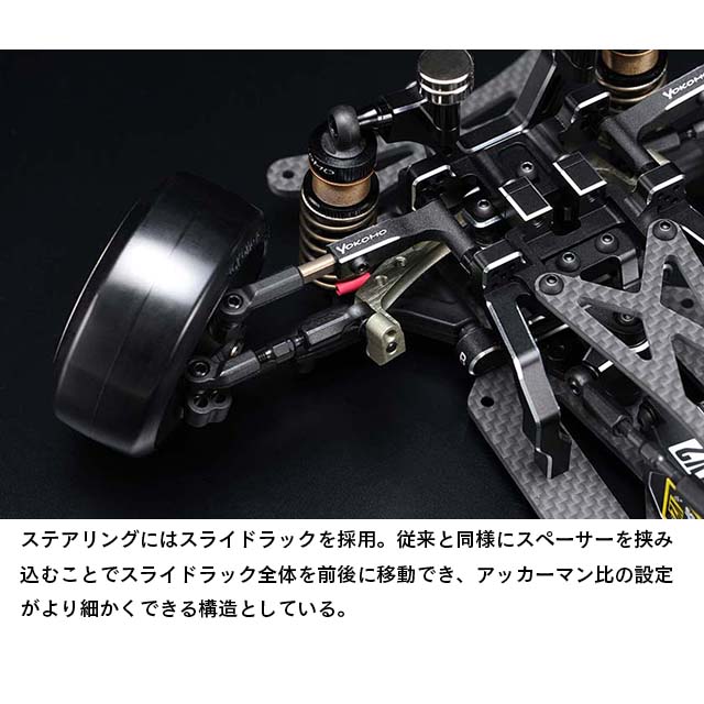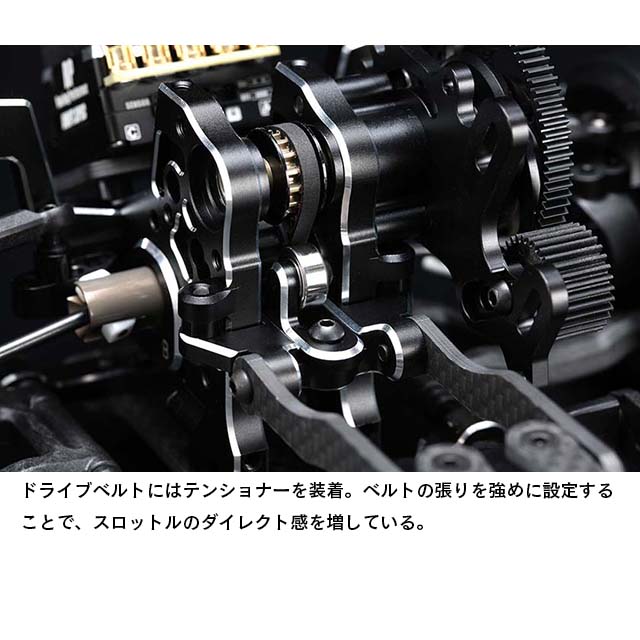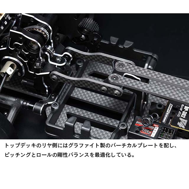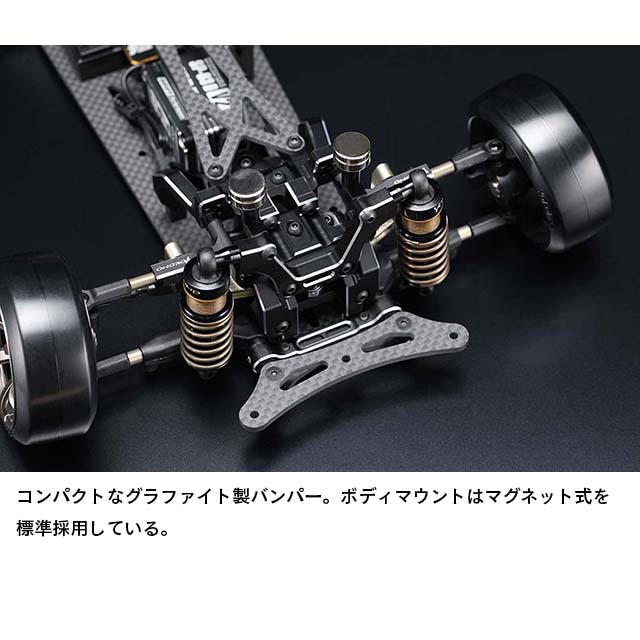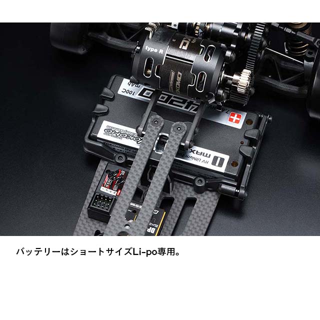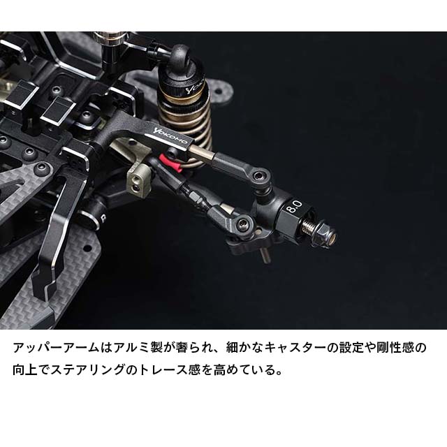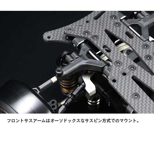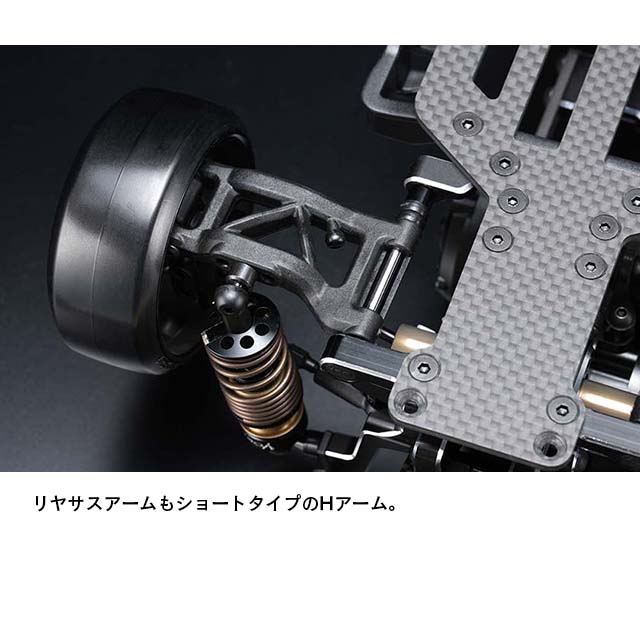 フロント周りでは剛性感によりフロントタイヤへの面圧を高め、コーナー脱出時などのコントロール性を引き出します。サスアームは前後共にサスピン式のHアームを採用していますが、従来のMDシリーズのAアームにも変更でき、今後のオプションパーツ展開も楽しみな設定です。