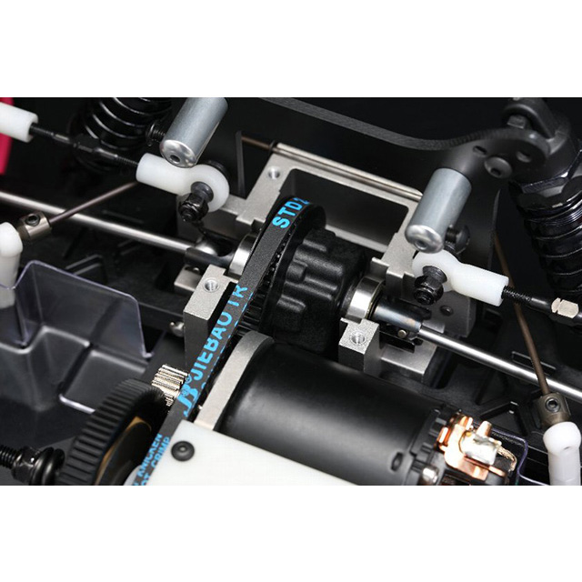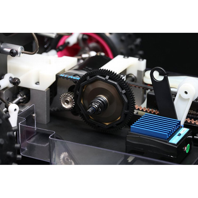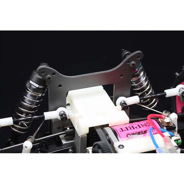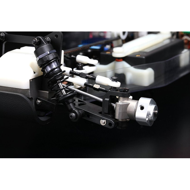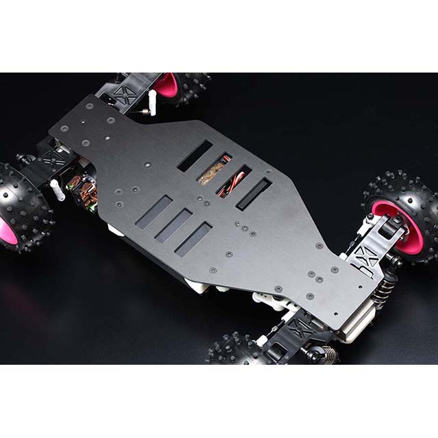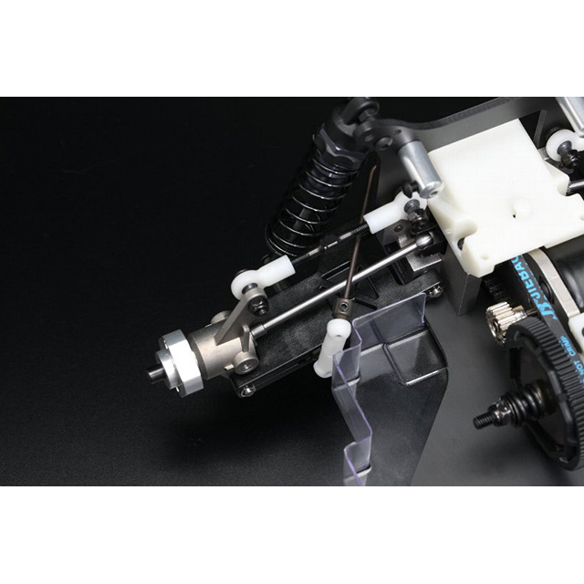 また、このモデルではメインシャーシ、前後ショックタワー、サーボステーなど高剛性のブラックカーボンを採用し、マシン剛性向上により走破性を高めています。ぜひ走行してお楽しみいただきたいマシンです。
