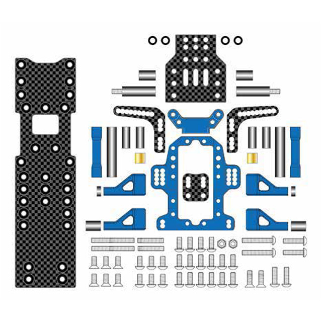 上下高精度切削アルミ製アームと4mm厚カーボンショックタワーを組み合わせることで、 優れた剛性・精度が再現性の高い走行を実現する高性能コンバージョンセットです。