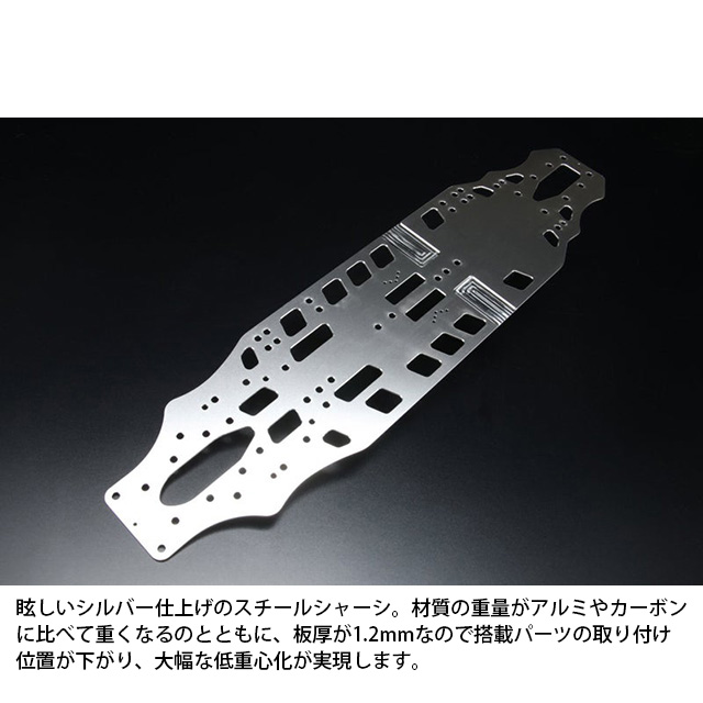 眩しいシルバー仕上げのスチールシャーシ。材質の重量がアルミやカーボンに比べて重くなるのとともに、板厚が1.2mmなので搭載パーツの取り付け位置が下がり、大幅な低重心化が実現します。