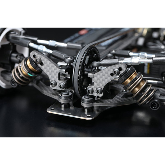 新型のMS2.0はメインシャーシにスチール素材を採用。グラファイトやアルミに比べても質量が重く、さらに1.2mm厚の薄型とすることで取り付けパーツが低い位置に搭載され、相対的に大幅な低重心化を果たしています。ハイサイドを抑えてコーナーリングの限界を高めるとともに、適度なしなりによる安定感も獲得し、ハイグリップ路面でのレースでアドバンテージを得ることが可能です。