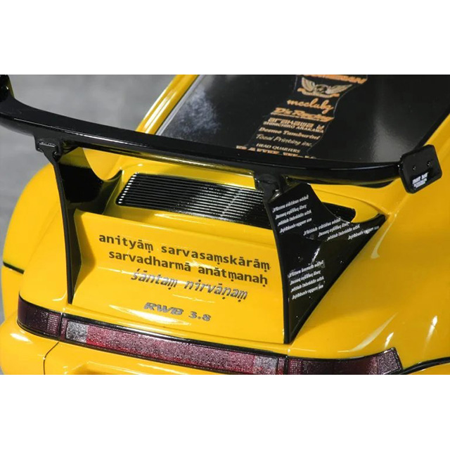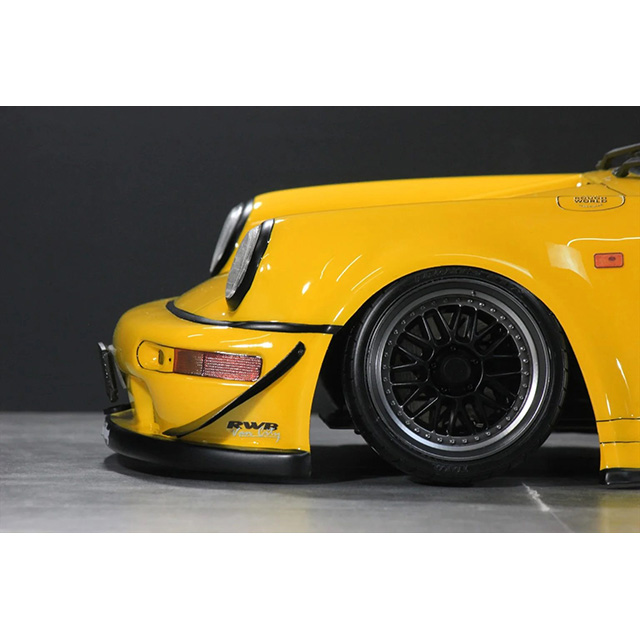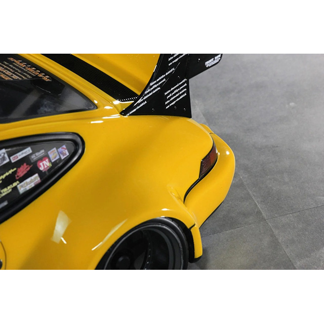 RWB創設者である中井氏をはじめ、多くの関係者の協力を経て第三弾コラボとなる、RWB964 TYPE がいよいよ登場。 実車を見ても派手な印象を受けるが、あくまでベースは964。そこにRWB の色が乗っていることを意識しての開発。